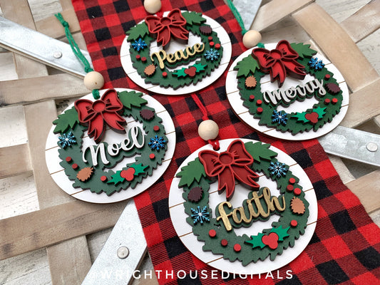 Layered Christmas Word Wreath Ornament Set - Faith Merry Peace Noel - Handdrawn Cut File For Glowforge Lasers - Digital SVG File
