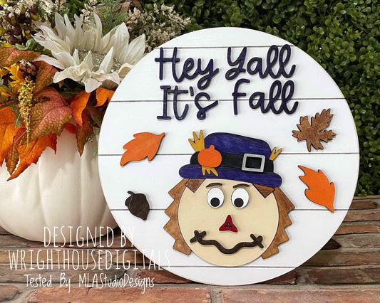 Hey Y'all It's Fall Scarecrow Autumn Door Hanger Round - Seasonal Sign Making and DIY Kits - Cut File For Glowforge Laser - Digital SVG File