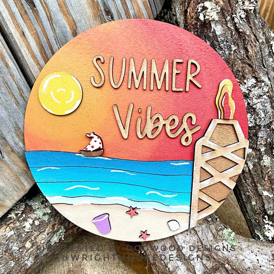 Summer Vibes Tiki Bonfire Beach Door Hanger Round - Sign Making and DIY Kits - Cut File For Glowforge Lasers - Digital SVG File
