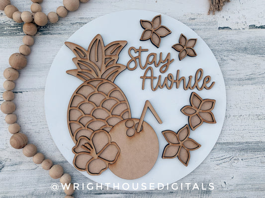 Stay Awhile Tropical Floral Summer Door Hanger Round - Sign Making and DIY Kits - Cut File For Glowforge Lasers - Digital SVG File